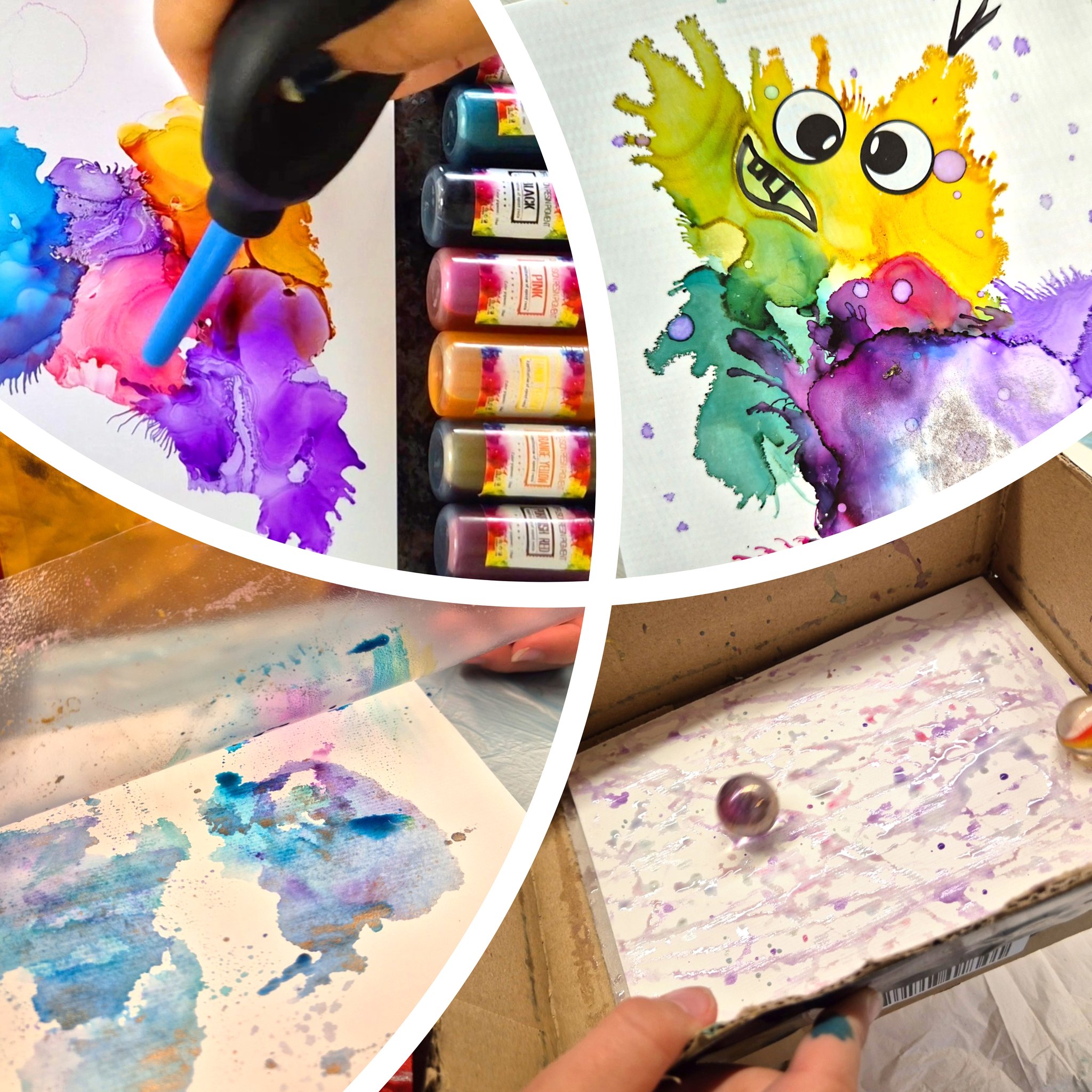 - Die Kreativ-Tinten werden auf die Postkarten getropft. Mit der Hand-Luft-Pumpe bringst du die Flecken in Form. Daraus können auch mit Augen und Mund lustige Monster entstehen.